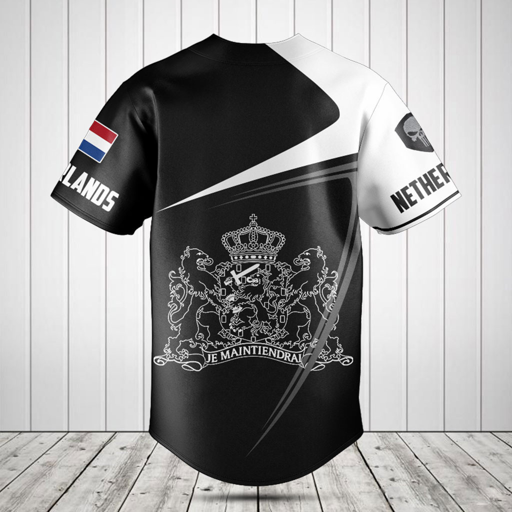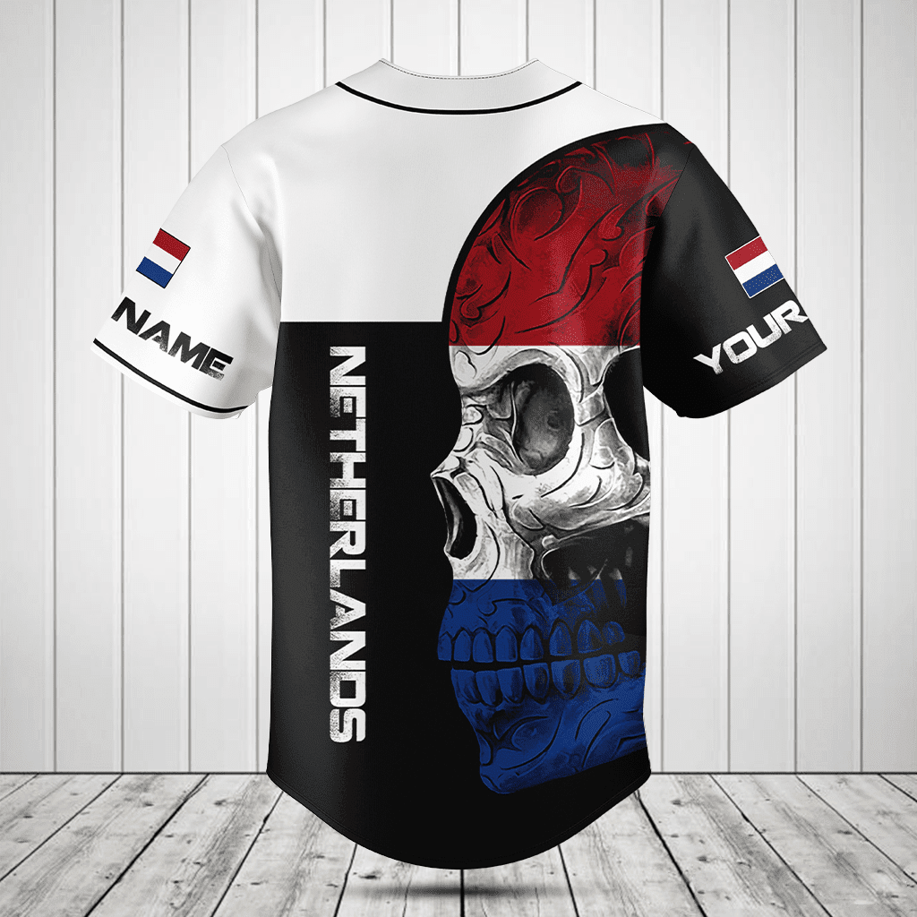Personalized Netherlands Symbol Black And White Skull Baseball Jersey