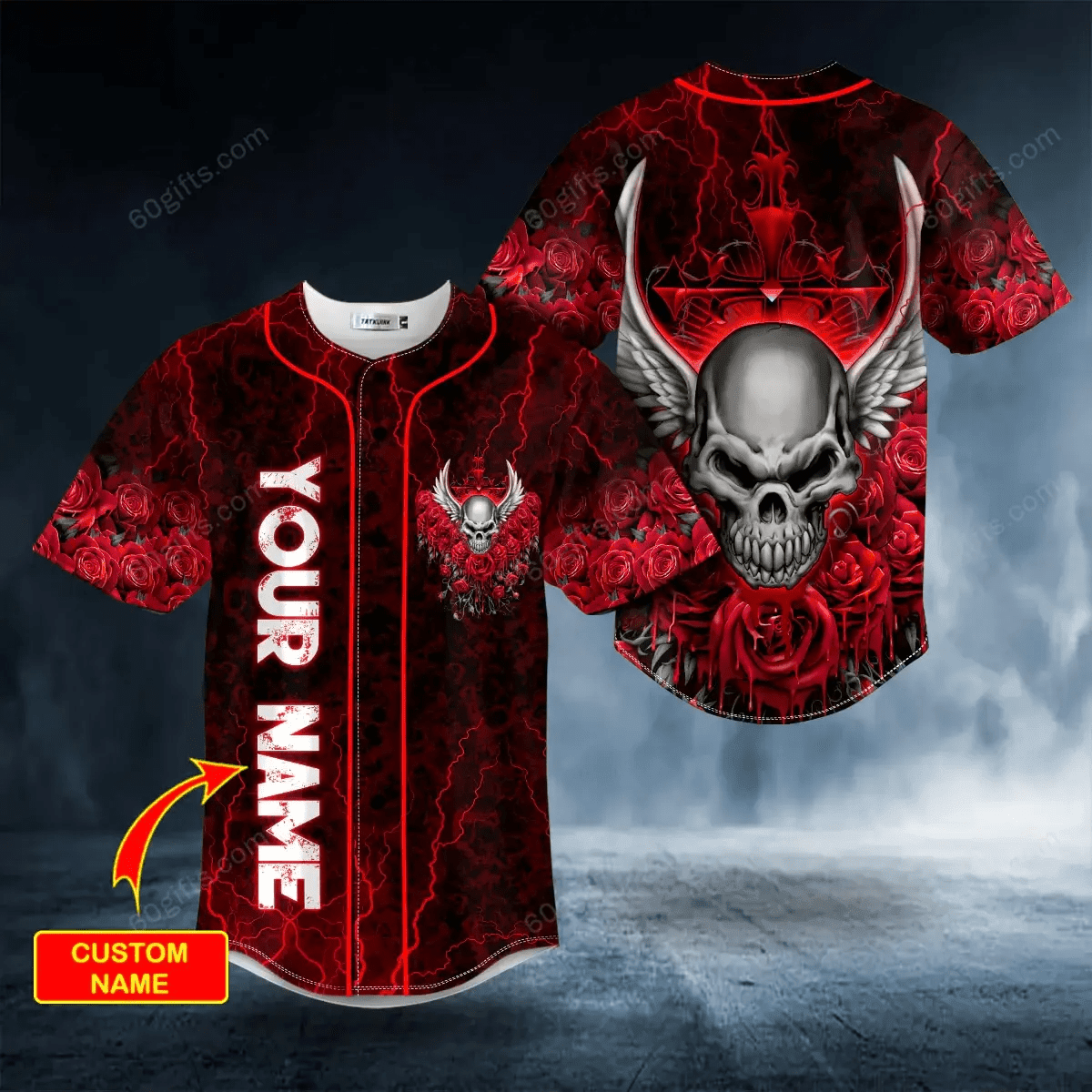 Personalized Red Roses Winged Angel Skull Baseball Jersey