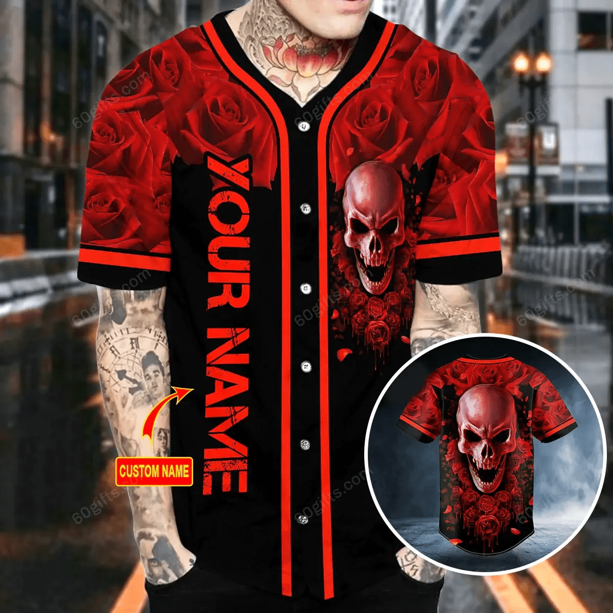 Personalized Skull Red Roses Beauty Skull Baseball Jersey