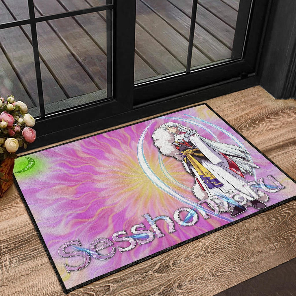 Inuyasha Anime Rubber Doormat Sesshomaru Standing Black Moon Retro Flower Looping Background Rubber Doormat Home Decor