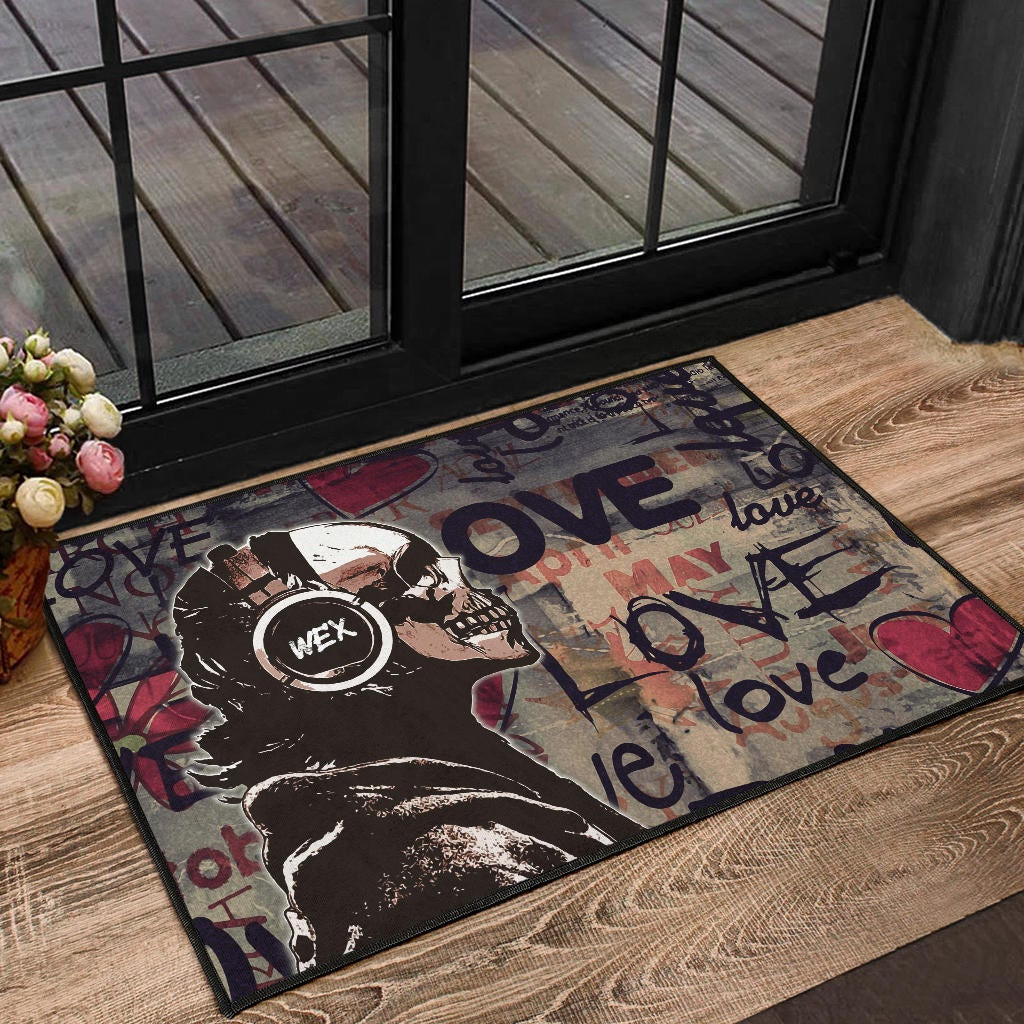 Love Rubber Doormat – Introvert Skeleton Wearing Headphone Love Patterns Rubber Doormat