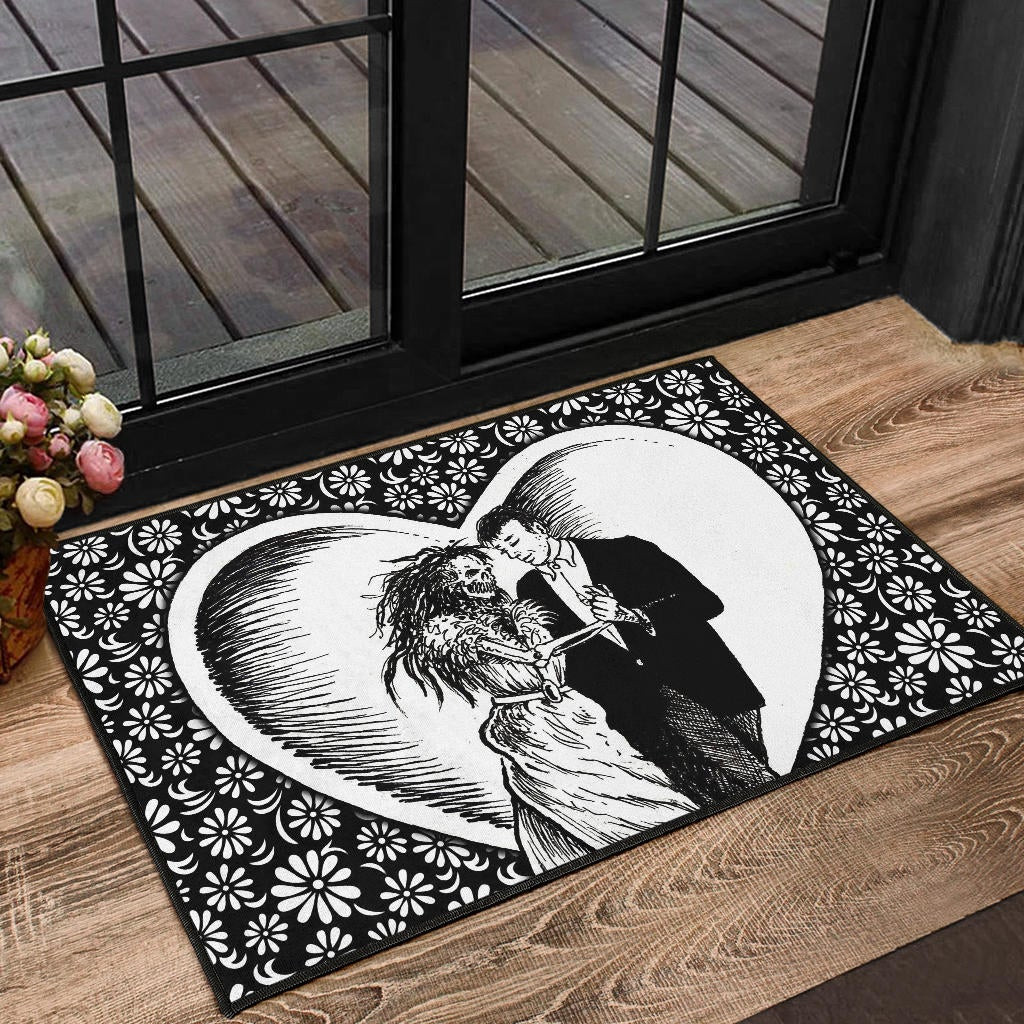 Love Rubber Doormat – Marriage Day Men With Skeleton Women Tiny Flower Patterns Rubber Doormat