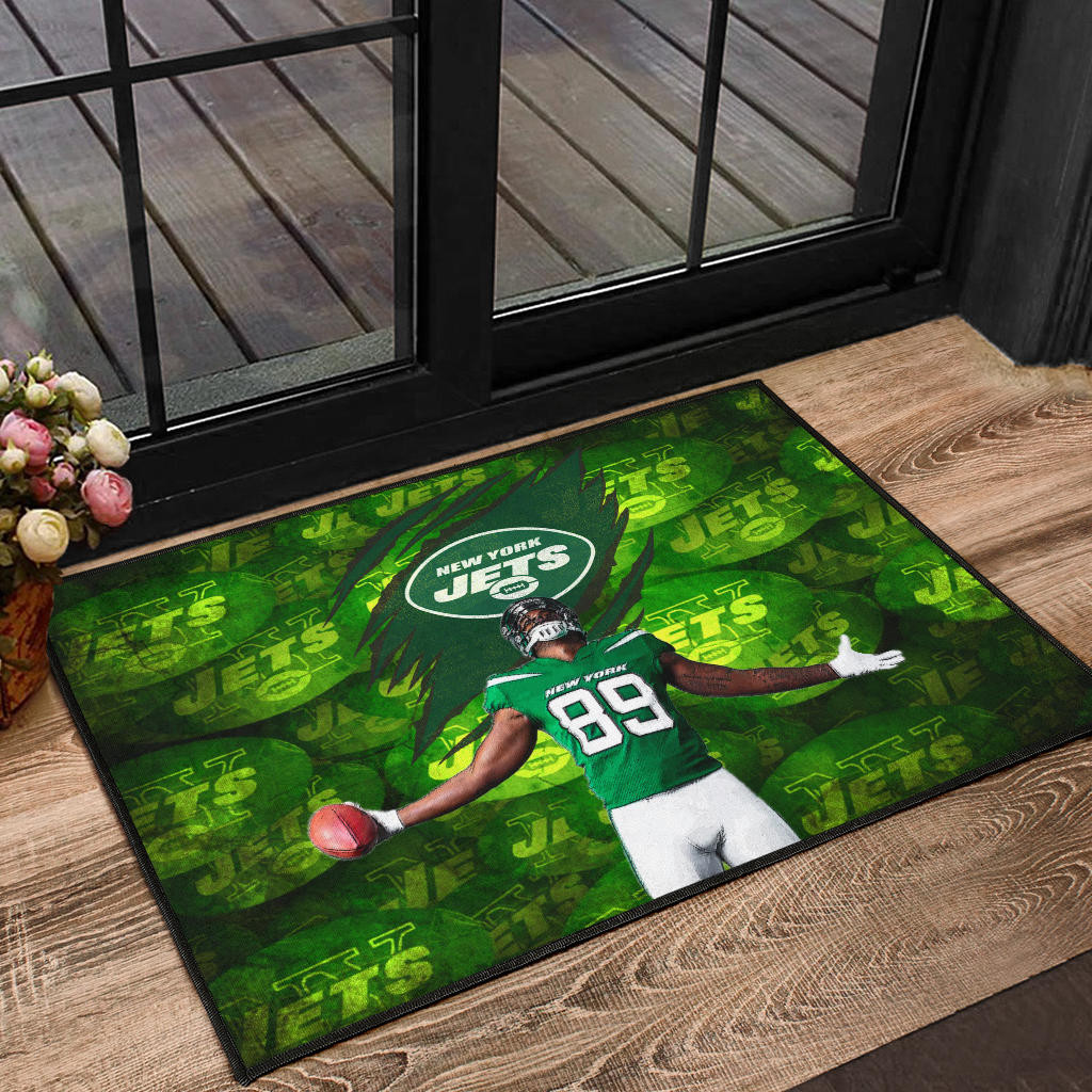 New York American Football Jets Football Player 89 Celebrating Score Holding Ball Rubber Doormat Home Decor