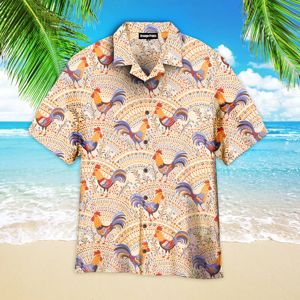 Chicken Roosters In Floral Ornament On A Beige Native Pattern Hawaiian Shirt