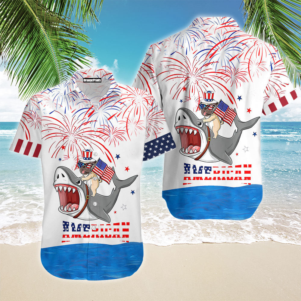Puppy Riding Shark With American Flag Firework Hawaiian Shirt