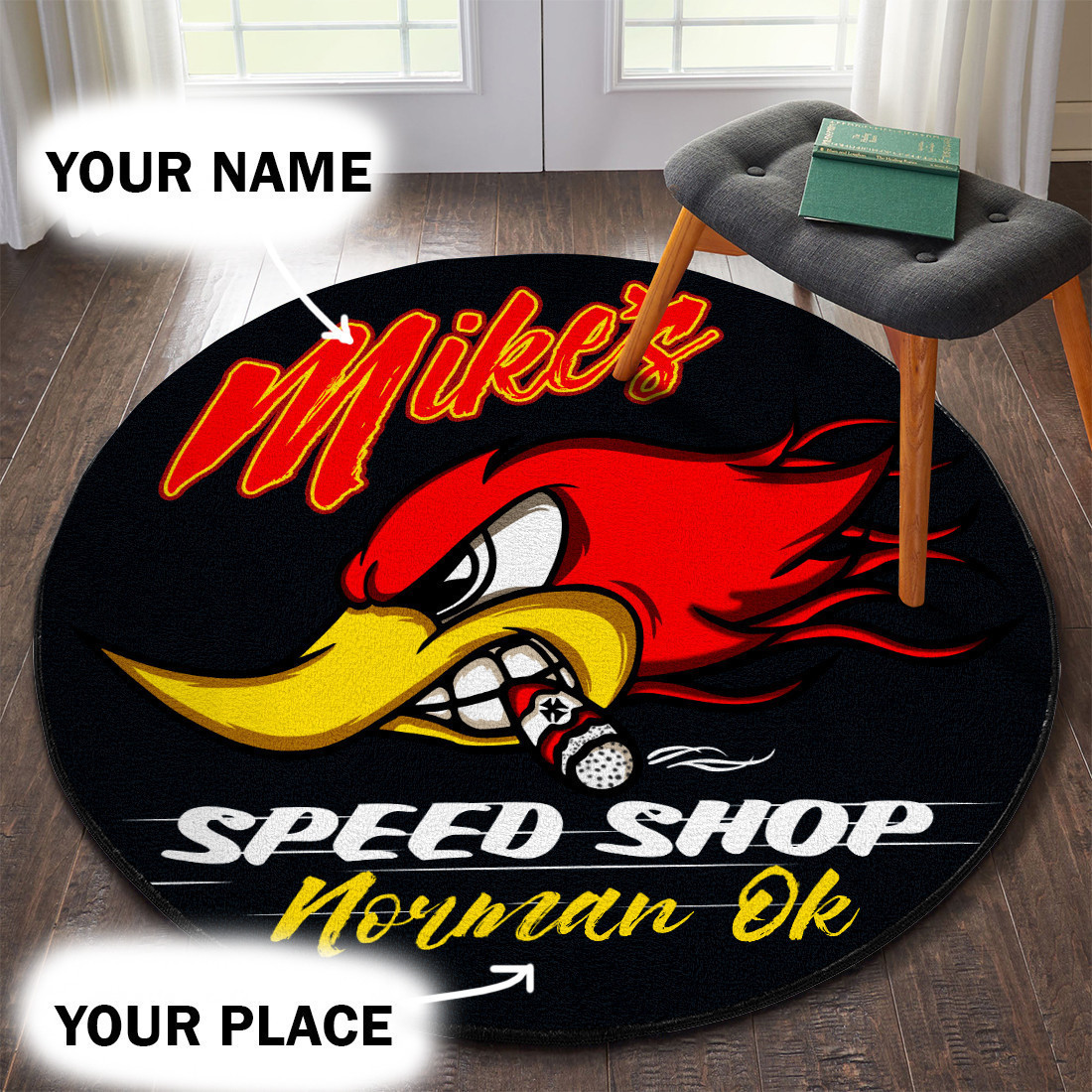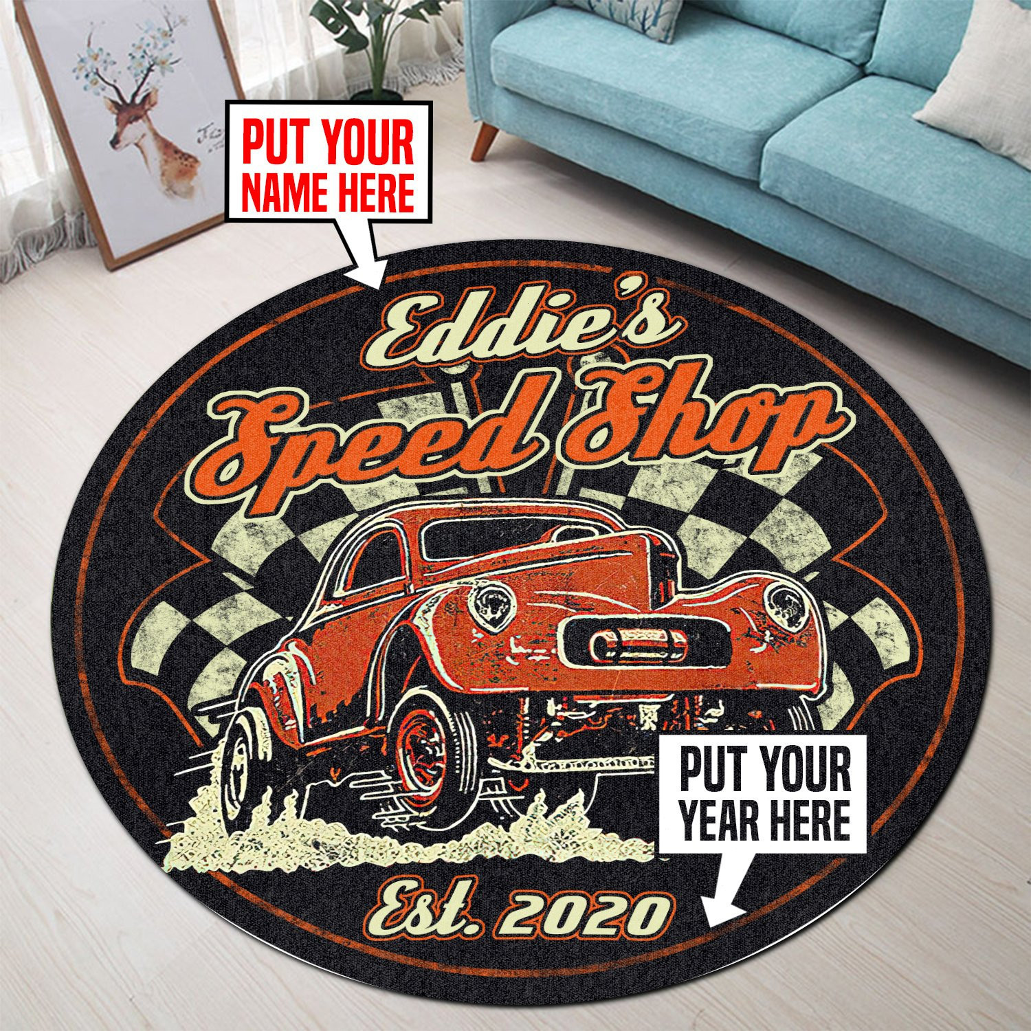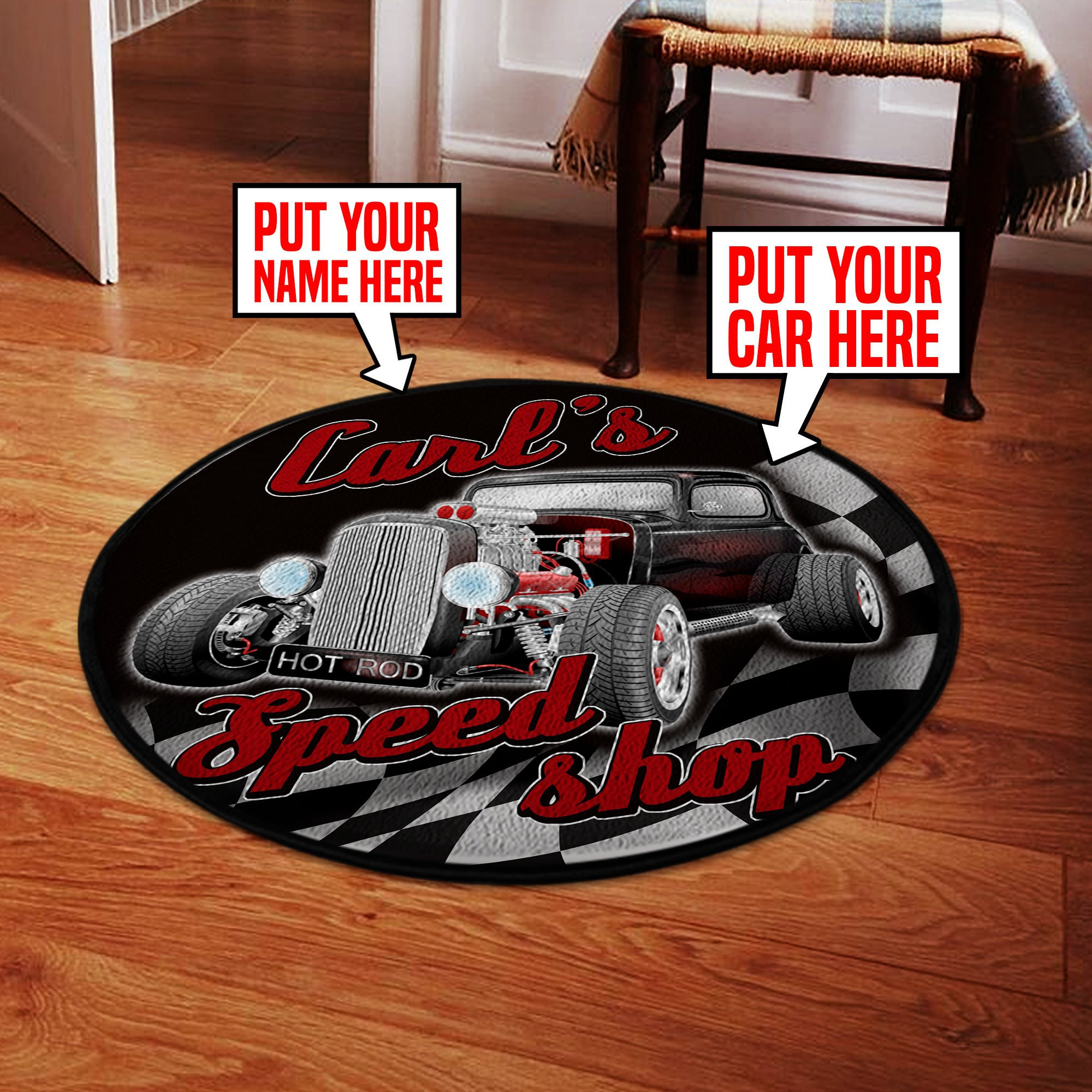Personalized Speed Shop Hot Rod Round Rug Carpet Bedroom Livingroom Home Decor