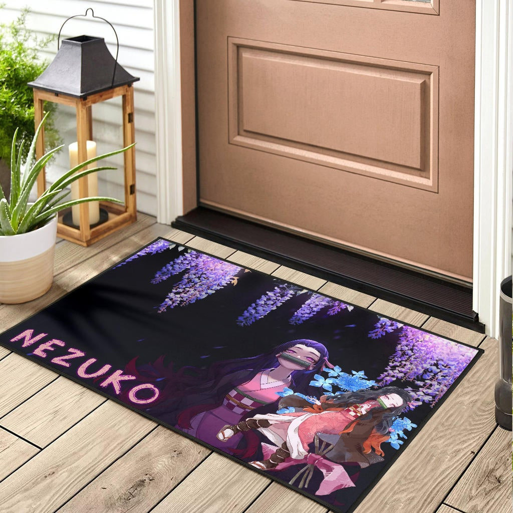 Demon Slayer Anime Pretty Nezuko Kamado Purple Flower Theme Rubber Doormat Home Decor