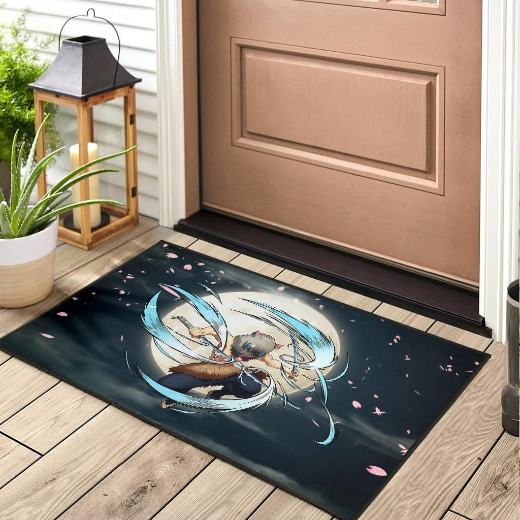 Demon Slayer Anime Rubber Doormat – Hashibira Inosuke Using Sword On Moon Cherry Blossom Rubber Doormat Home Decor