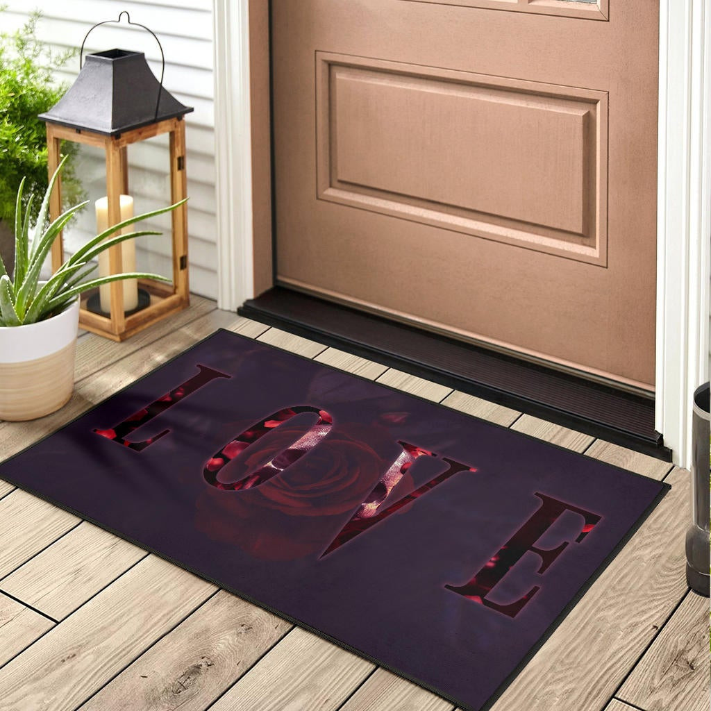 Love Rubber Doormat – LOVE Text Rose Flower Black Background Rubber Doormat